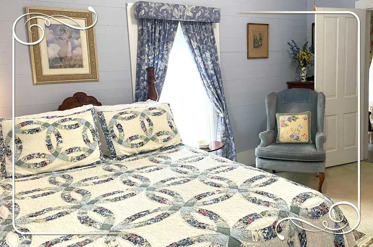 Our largest room, the Victorian features a king-size bed and a door to the spacious, private deck along the front of the Inn. Enjoy sitting areas and plenty of space inside this second-floor room.